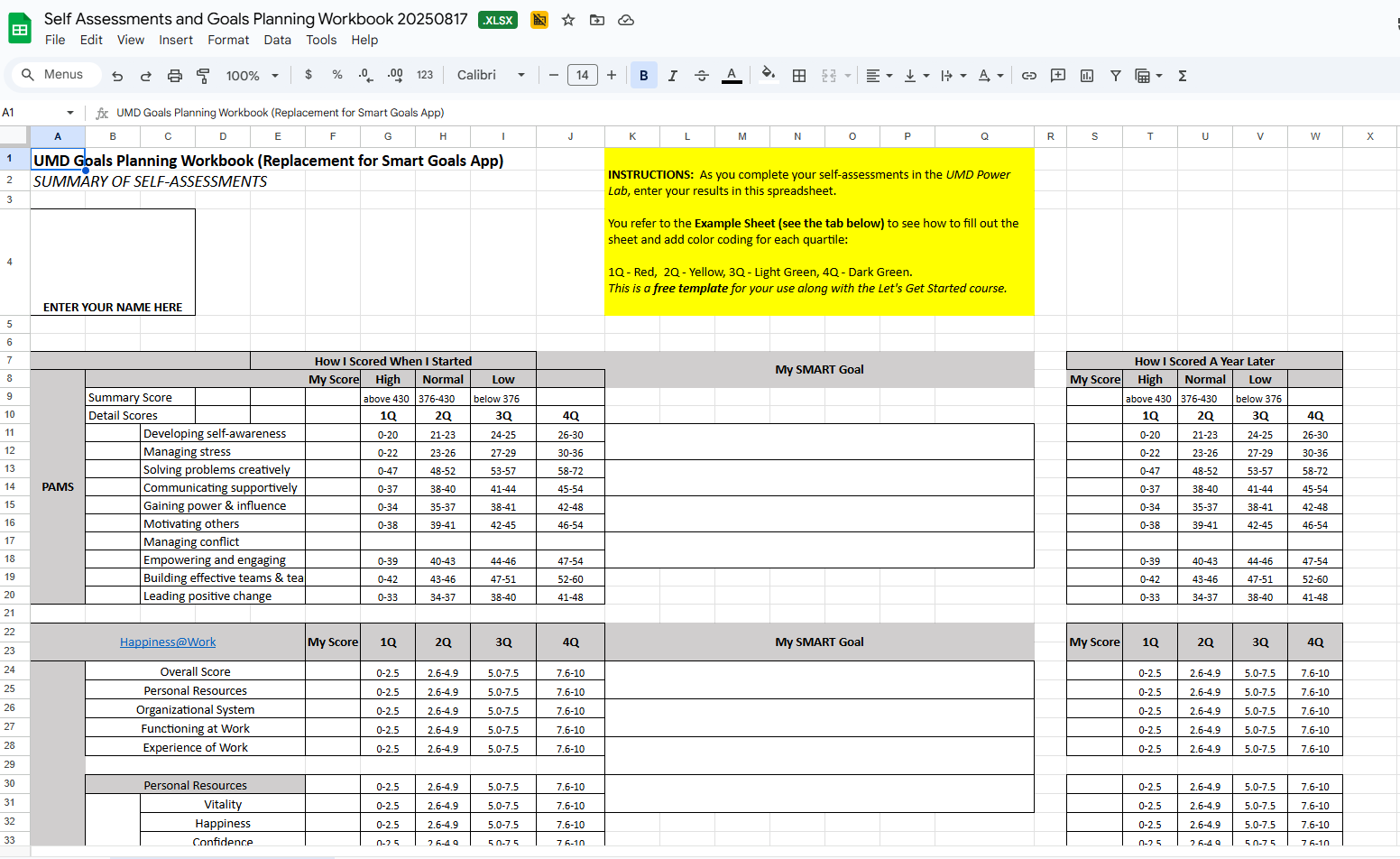 This is a workbook is for storing and reviewing your self-assessment results, setting goals, and building action plans. This workbook replaces the previous SMART Goals App and is what UMD uses for its graduate students learning this same content.